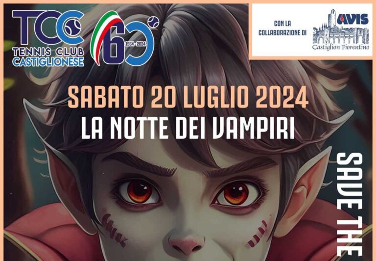 La serata clou sarà quella del sabato con tanti amici del Tennis Club Castiglionese presenti ed un programma interessantissimo: Cocktail Aperitivo Inaugurale dei “Vampiri”, Cena a buffet con tema “La Notte dei Vampiri” a cura dello staff del Gallo Nero al TCC ed accompagnamento musicale da parte di Dj Dave Molì, dalle 22 open bar e “Dracula Party” con Silent Party dalle 24.