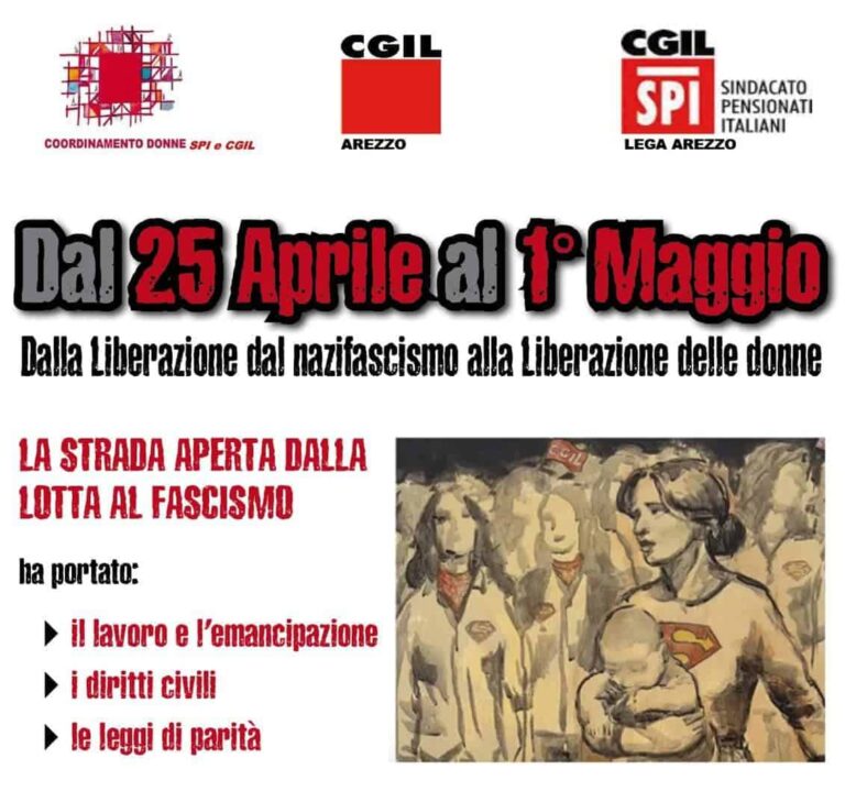 Noi donne del Coordinamento Spi e Cgil di Arezzo non intendiamo minimamente dimenticare e fare dimenticare il grande e determinante apporto delle donne nella gestione e nell’organizzazione del movimento di liberazione dal nazifascismo e del contributo di quelle compagne e sorelle che attuarono anche la resistenza civile femminile. La resistenza delle donne per anni รจ stata taciuta sia a livello istituzionale che storiografico e talvolta l’impegno femminile รจ stato considerato e relegato ad un ruolo secondario cosรฌ che la lotta di liberazione per molti, รจ stata solo โmaschileโ.