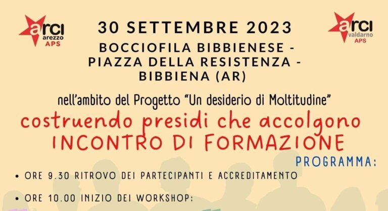 Domani, sabato 30 Settembre dalle ore 9:30 fino alle 13:00 presso il circolo Arci Bocciofila Bibbienese, in piazza della Resistenza, si terrà un seminario di approfondimento e formazione dal titolo “ Costruendo presidi che accolgono”.