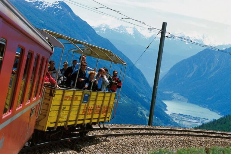 Dopo Cavaglia il treno s’inerpica per circa 400 metri di dislivello lungo la montagna, in un carosello di ponti, tunnel e gallerie paravalanghe e con unโinarrestabile ascesa il trenino si prende una pausa panoramica proprio ad Alp Grรผm.