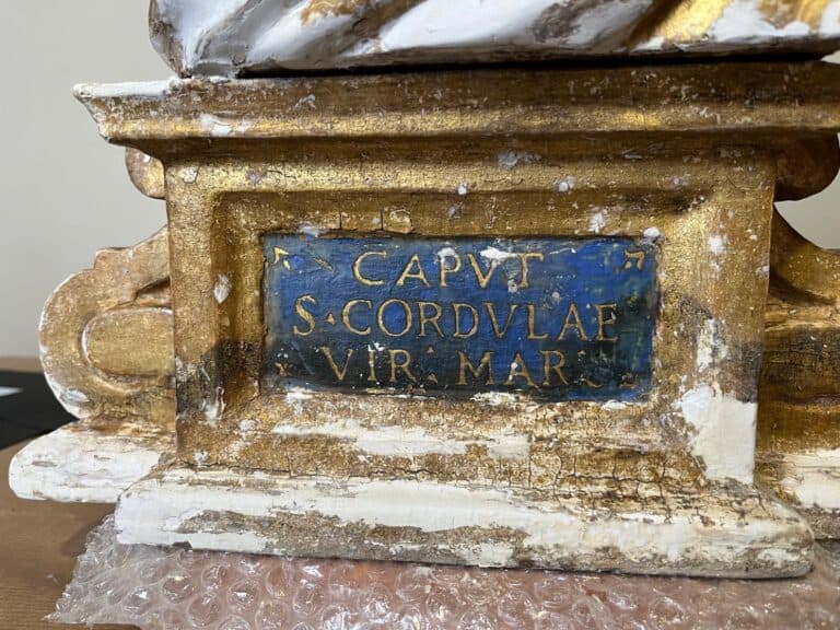 Il busto contiene le reliquie del capo di santa Cordula ed è un pregevole esempio di intaglio seicentesco di gusto ancora classicheggiante.