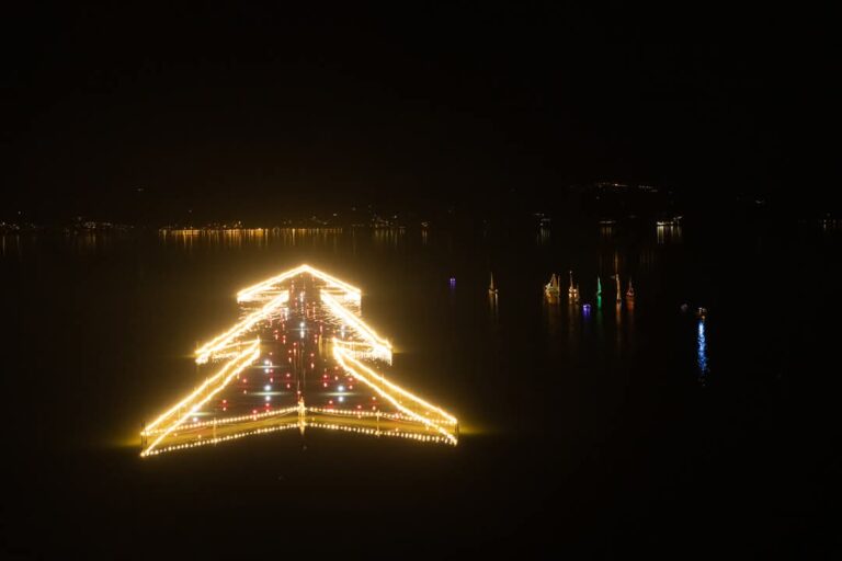 Grande protagonista lui, sua Maestà l’Albero di Natale più grande del mondo costruito sull’acqua con le sue 2.400 luci perimetrali e le 250 lampade interne, ma soprattutto una lunghezza di oltre un chilometro (1.080 metri per la precisione) e 50 metri di larghezza grazie a 7.165 metri di cavo sorretti da 166 pali portanti.