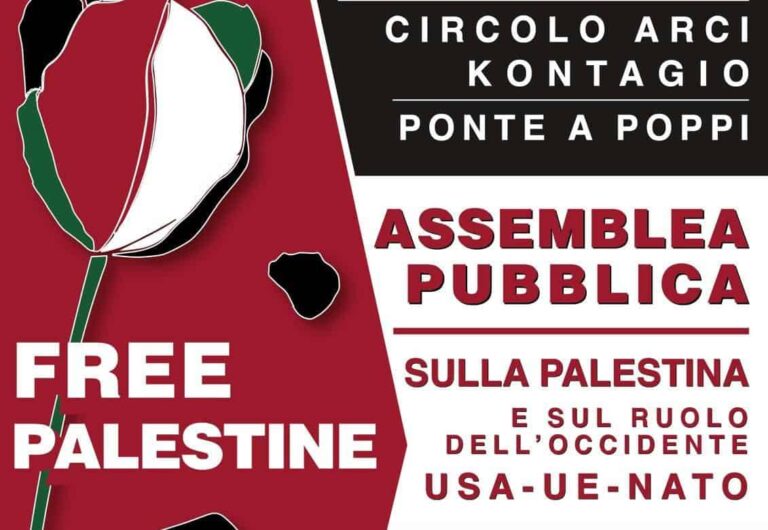 Mantenendo l’impegno, lanciamo quindi questa assemblea pubblica: una discussione franca ed aperta per parlare di Palestina e di noi, del ruolo degli Stati Uniti, della NATO, dell’UE, quindi dell’Italia, nella guerra condotta contro il popolo palestinese.