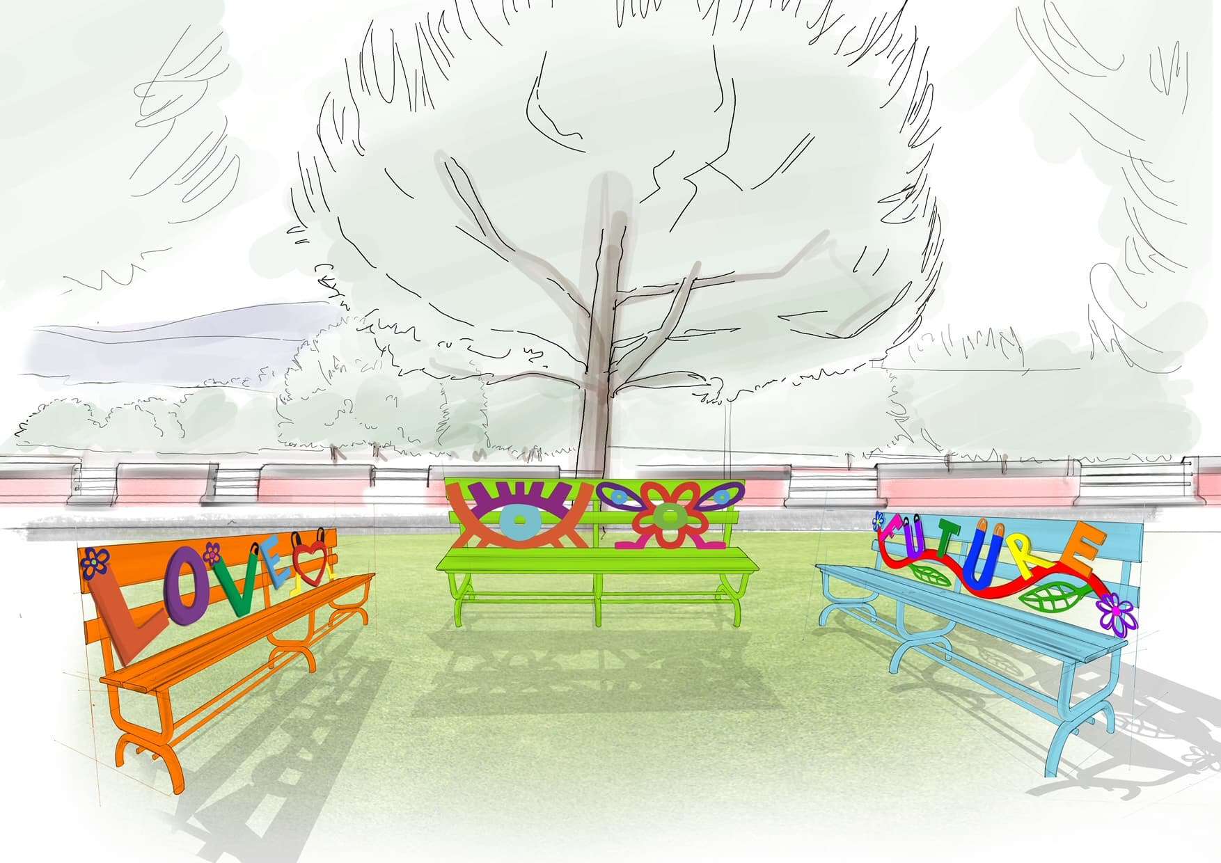 “Tre panchine, dai colori accesi, poste a semicerchio in modo che le persone che si siedono possano parlarsi e socializzare.