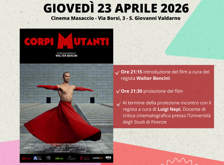 Giovedì 23 aprile, alle 21,15, sarà presentata in prima assoluta “Corpi mutanti”, il nuovo documentario scritto e diretto dal regista valdarnese Walter Bencini, che sarà presente in sala per incontrare il pubblico.