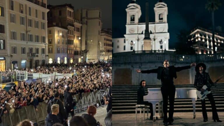 Lo speciale live, iniziato intorno alle 21, è stato occasione per presentare in anteprima “Comuni mortali”, il nuovo disco di Lauro in uscita il 18 aprile. Tra vecchie hit (come “Rolls Royce”, “16 marzo” e “Amore disperato”), e nuovi pezzi, tra cui il singolo sanremese “Incoscienti giovani” e il nuovo “Amor”, Lauro ha infiammato la piazza facendo cantare tutti i coraggiosi che – sfidando il meteo – sono accorsi alla location già dal primo pomeriggio. E per salutarli, Achille Lauro ha anche intonato “Notte prima degli esami” di Antonello Venditti. Durante lo show sulla scalinata di Trinità dei Monti, Boss Doms ha fatto “irruzione” per salutare i fan dell’amico e collega, molti dei quali della prima ora.
