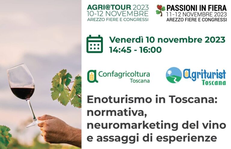 L’enoturismo in Toscana, normativa, neuromarketing del vino e assaggi di esperienze. È il tema dell’incontro che i terrà venerdì 10 novembre ore 14,45 nell’ambito di Agri@tour, la fiera dell’Agriturismo in svolgimento ad Arezzo Fiere e Congressi.