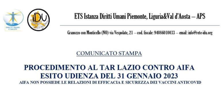 All’udienza del 31 gennaio 2023 – precisa l’IDU con il Comunicato Stampa di sotto – AIFA non si è presentata (neanche con l’avvocatura dello Stato).