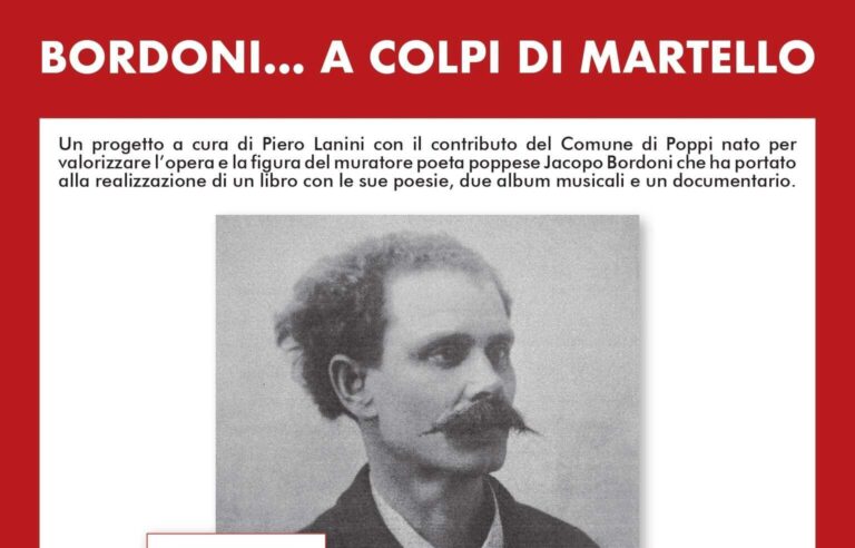 Verrà presentato venerdì 5 aprile 2024 alle ore 21:00 presso il Salone delle feste del Castello dei Conti Guidi di Poppi, l’ultimo progetto legato alla valorizzazione di Jacopo Bordoni (1860-1936), messo in campo dal Comune di Poppi, da Piero Lanini (Società del Chiassobujo) e da RadiciMusic Records sull’opera del poppese poeta-muratore.