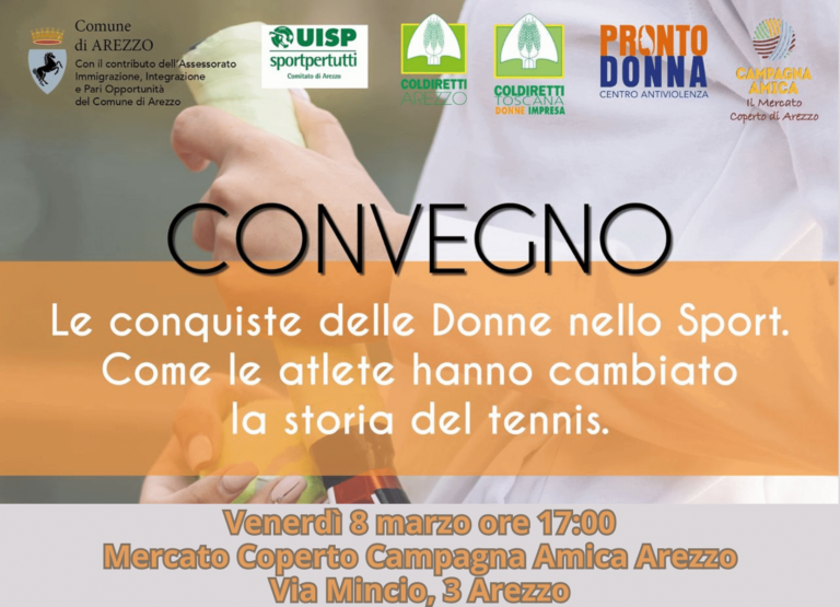 “Le conquiste delle Donne nello Sport. Come le atlete hanno cambiato la storia del tennis”, un evento aperto a tutta la cittadinanza che si terrà venerdì 8 marzo alle ore 17:00 al Mercato Coperto di Campagna Amica Arezzo organizzato e promosso da Pronto Donna Centro Antiviolenza con Coldiretti Arezzo, Coordinamento Donne Coldiretti e UISP Comitato territoriale di Arezzo in occasione della Giornata internazionale della Donna.