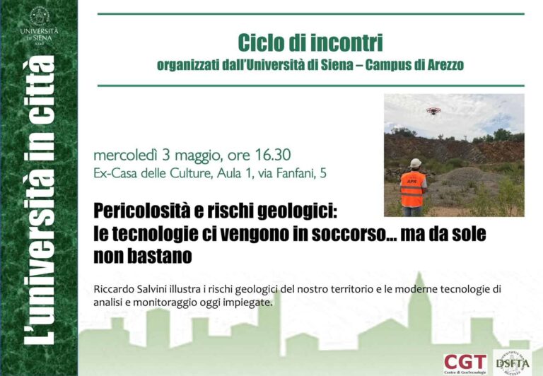 “Pericolosità e rischi geologici: le tecnologie ci vengono in soccorso… ma da sole non bastano!” è il titolo dell’incontro, aperto alla cittadinanza, che si terrà il prossimo 3 maggio alle ore 16.30 presso la Ex Casa delle Culture (via Fanfani 5) ad Arezzo.