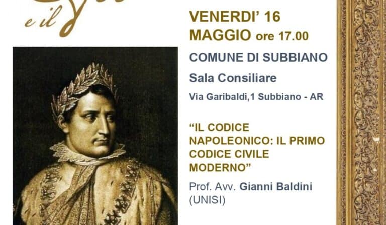 Venerdì 16 maggio alle ore 17 nella sala Consiliare del Comune di Subbiano il seminario con il prof. avv. Gianni Baldini , dell’Università di Siena, si tratterà de “Il Codice Napoleonico: il primo codice civile moderno”. Divorzio, matrimonio civile, libertà di testamento…tutto parte da questo codice.