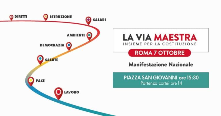La manifestazione nazionale del 7 ottobre a Roma sarà per il lavoro, contro la precarietà, per il contrasto alla povertà, contro tutte le guerre e per la pace, per l’aumento dei salari e delle pensioni, per la sanità e la scuola pubblica, per la tutela dell’ambiente, per la difesa e l’attuazione della Costituzione contro l’autonomia differenziata e lo stravolgimento della nostra Repubblica parlamentare.