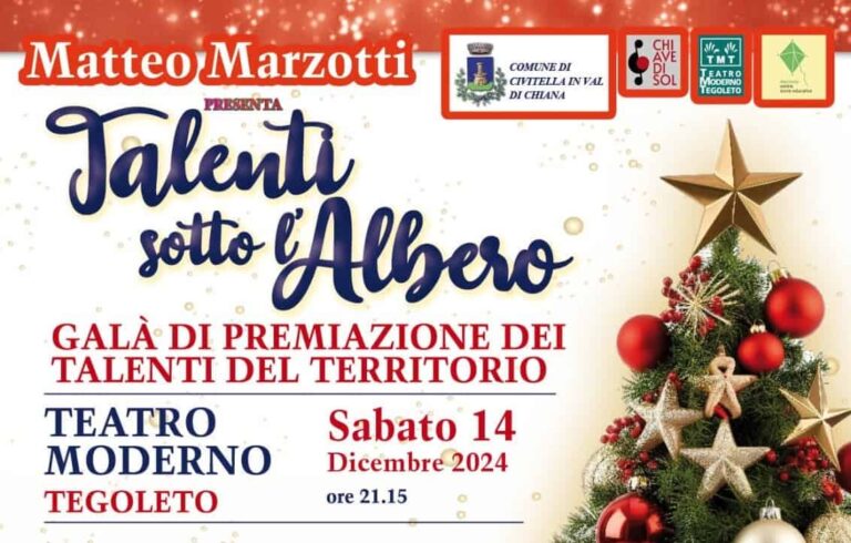 Torna sabato 14 dicembre, dalle ore 21.15, l’appuntamento con Talenti sotto l’Albero. Galà di Premiazione dei Talenti del territorio al Teatro Moderno di Tegoleto.