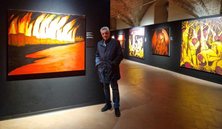 Corpi aggrovigliati, volti demoniaci, fiamme incandescenti dipinte su tele che raccontano i capitoli descritti da Dante e lo fanno con una potenza d’immagine così forte da creare un turbinio di emozioni fortissime.