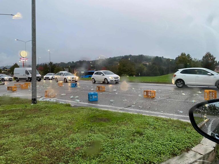 Nel pomeriggio di oggi, a Arezzo, un camion ha perso il proprio carico di cassette contenenti bottiglie di vetro su una strada molto trafficata.