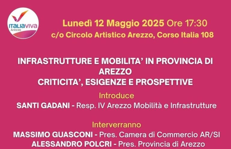 Lunedì 12 maggio alle ore 17:30 presso il Circolo Artistico di Arezzo (Corso Italia 108) si terrà un convegno-dibattito sul tema “Infrastrutture e mobilità in provincia di Arezzo: criticità, esigenze e prospettive”.
