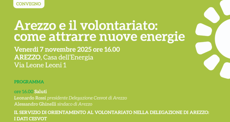 Sono alcuni dati che verranno presentati durante il convegno “Arezzo e il volontariato: come attrarre nuove energie” organizzato dalla delegazione Cesvot aretina in programma venerdì 7 novembre alle 16 alla Casa dell’Energia ( Via Leone Leoni 1) ad Arezzo.