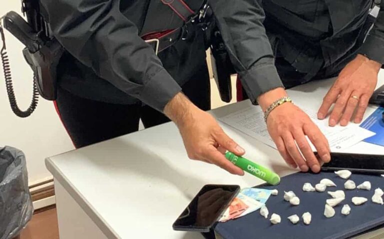 Il predetto conducente assumeva fin da subito un atteggiamento sospetto e nervoso, tale da far temere che sulla sua persona o all’interno del veicolo condotto dallo stesso, potesse occultare sostanze stupefacenti o qualcos’altro di illecito, pertanto gli operanti procedevano all’immediata perquisizione sul posto conclusasi con esito positivo. Gli investigatori rinvenivano, all’interno del vano portaoggetti della portiera anteriore sinistra, lato guida del veicolo, una sigaretta elettronica e, all’interno del serbatoio del predetto dispositivo venivano scoperti n.20 (venti) involucri in cellophane trasparente contenenti stupefacente del tipo cocaina del peso complessivo di gr. 13 (tredici) circa, che veniva immediatamente sottoposta a sequestro.
