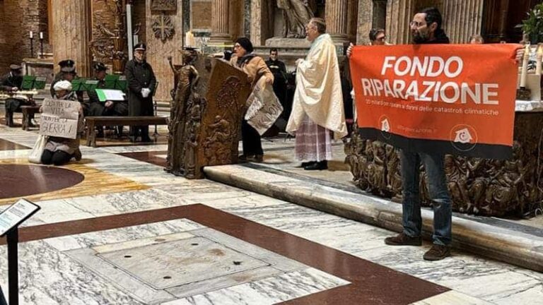 All’interno del Pantheon, nel corso della Messa per l’Immacolata Concezione, gli attivisti di Ultima Generazione dopo il segno della Pace si sono messi davanti all’altare con manifesti con scritto “soldi per la vita, non alla guerra“.