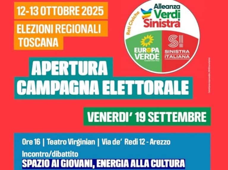 A seguire, dalle ore 19.00, la campagna si sposterà nello spazio Menchetti all’interno del Parco Pertini, per un momento conviviale con apericena accompagnato dallo slogan “Per una Toscana giusta, verde e solidale”. Sarà presente anche il deputato Filiberto Zaratti (AVS).
