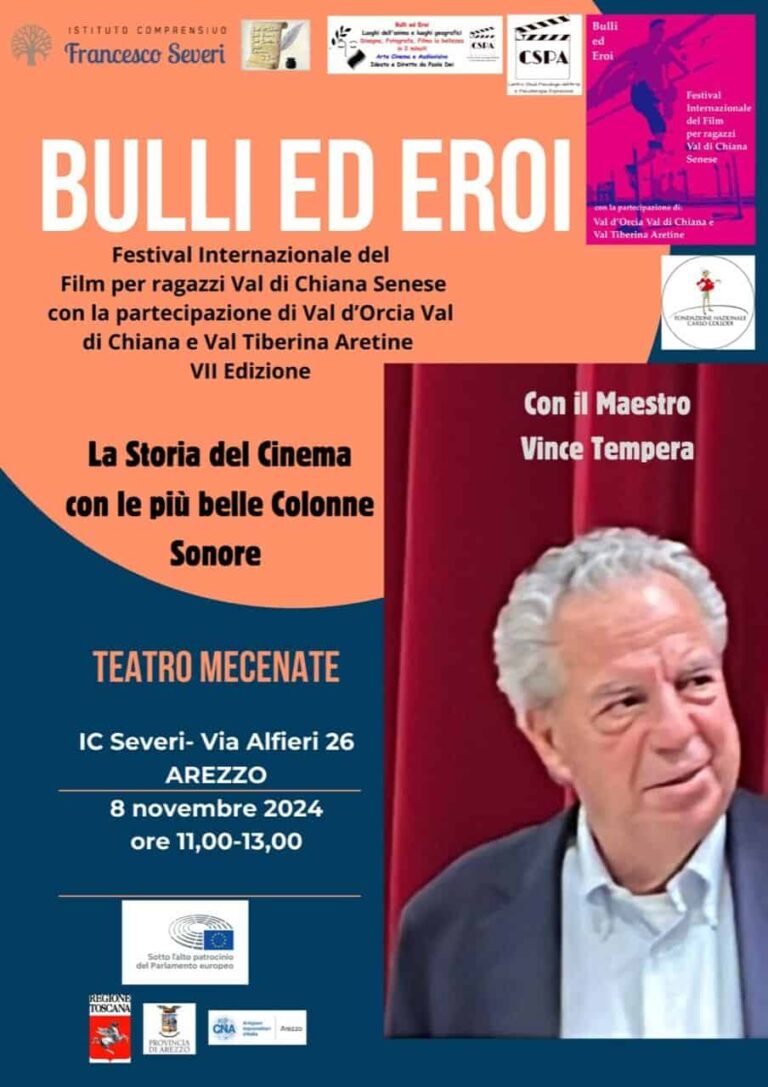 Dopo le intense giornate a Serre di Rapolano e Montepulciano, Bulli ed Eroi Festival Internazionale del Film per ragazzi Val di Chiana senese con la partecipazione di Val d’Orcia Val di Chiana e Val Tiberina aretine diretto da Paola Dei e organizzato dal Centro Studi di Psicologia dell’Arte e Psicoterapie Espressive APS, continua a diffondere messaggi contro il bullismo e la violenza attraverso il cinema e le professioni legate a questa arte e si sposta ad Arezzo al Teatro Mecenate  (via Dante Alighieri) dove domani  8 novembre, alle ore 11,00 verrà proiettato il cortometraggio dedicato a Willy Monteiro Duarte realizzato da Side Academy di Verona e, a seguire, il Maestro Vince Tempera si esibirà con le più belle colonne sonore della settima arte.
