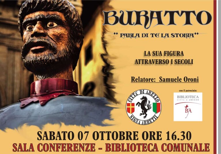 La conferenza intende approfondire, attraverso un accurato studio storiografico, il personaggio di Buratto. L’incontro è incentrato su vari temi: nella prima parte vengono esaminati i vari tornei cavallereschi, in cui la sua figura ha un ruolo significativo come protagonista da sfidare. Si passa poi ad approfondire il Buratto all’interno della Giostra del Saracino di Arezzo, evidenziando le caratteristiche innovative. L’ultima parte, invece, è incentrata su un tema che possiamo definire inedito: a quale personaggio storico si ispira il nostro Buratto?