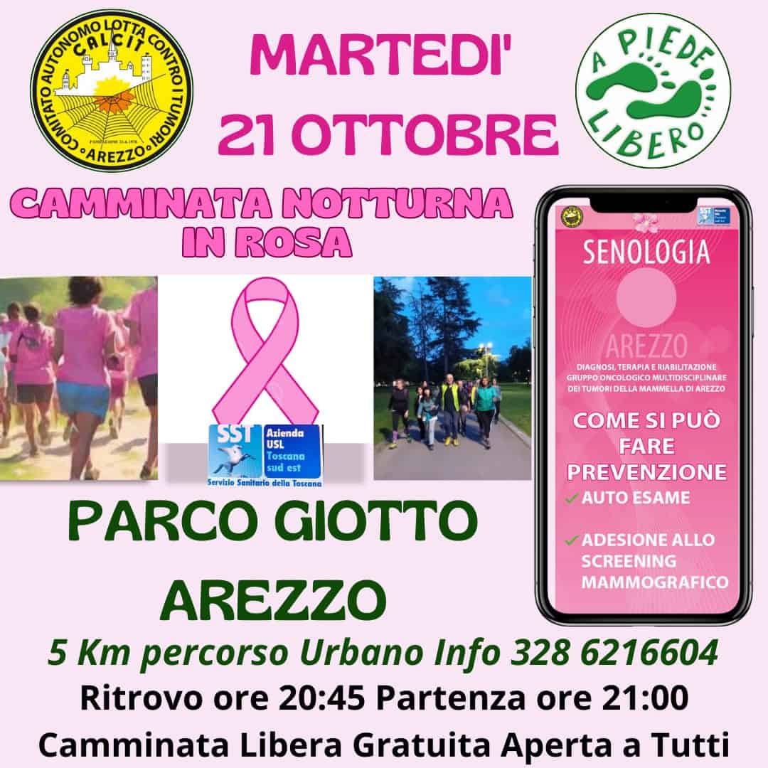 Martedì 21 ottobre 2025, torna ad Arezzo la Camminata notturna in rosa, evento promosso da A Piede Libero insieme al Calcit di Arezzo, con il patrocinio gratuito della Azienda USL Toscana Sud Est – Senologia Arezzo, in occasione del Mese della Prevenzione del Tumore al Seno.