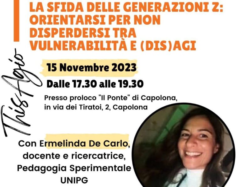 “Mercoledì 15 Novembre avremo un primo incontro dal titolo “La sfida delle generazioni Z: orientarsi per non disperdersi tra vulnerabilità e (dis)agi” conferma Lia Sisti Assessore del Comune di Capolona “un incontro che si svolgerà dalle 15,30 alle 19,30 presso i locali della Proloco “Il Ponte” di Capolona, in via dei Tiratoi, 2, con la prof.ssa Maria Ermelinda De Carlo, docente e ricercatrice, pedagogia sperimentale dell’Università di Perugia.”
