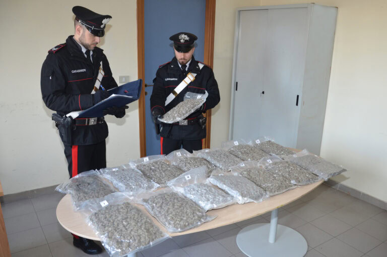 Proprio l’atteggiamento assunto dall’uomo, ha convinto i militari dell’Arma ad approfondire il controllo e a procedere alla perquisizione dell’autovettura, nel cui bagagliaio, è stato rinvenuto un pacco contenente15 involucri di sostanza stupefacente del tipo marijuana, conservati sottovuoto, del peso complessivo di circa 7.300 grammi.
