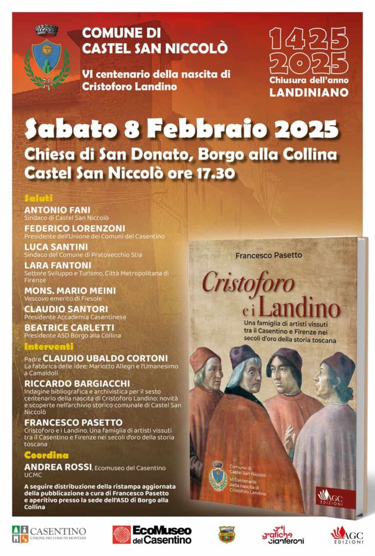 Sabato 8 Febbraio 2025, dalle ore 17,30, presso la Chiesa di San Donato a Borgo alla Collina – Castel San Niccolò, l’edificio che accoglie le sue spoglie mortali, si concluderanno le celebrazioni in onore di Cristoforo Landino a seicento anni esatti dalla sua nascita.