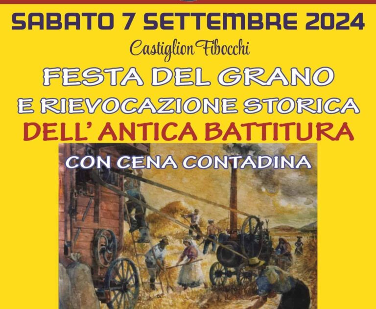 Domani, sabato 7 settembre, a Castiglion Fibocchi, su iniziativa del Camae (Club amatori macchine agricole d’epoca), d’intesa con l’associazione Ottava Torre e con il patrocinio del comune di Castiglion Fibocchi, è in programma una nuova edizione della «Festa del grano e rievocazione storica dell’antica battitura, con cena contadina».