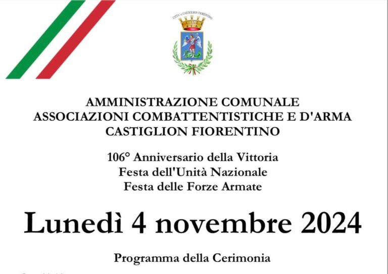 Lunedì 4 novembre, quindi, si tiene la cerimonia del 106° anniversario della Vittoria Festa delle Forze Armate che prevede alle ore 11.30 il raduno presso i giardini pubblici di piazza Matteotti delle autorità Civili, Religiose, Militari, Associazioni Famiglie Caduti e Dispersi in Guerra, Organizzazioni dei Mutilati, dei Combattenti e Reduci, Partiti Politici, Organizzazioni Sindacali, Scolaresche, Associazioni di Volontariato e Cittadinanza;