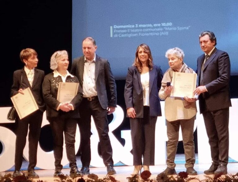 “Le “Maestre del Commercio” Castiglionesi premiate dalla Confcommercio Arezzo per iniziativa dell’Associazione 50 & Più, Anna Bizzi della Blujeansmania, Uliana Moretti del Ristorante da Muzzicone ed Emanuela Rebiscini della Sfizzeria. Una vita dedicata al lavoro e alla nostra Città”.