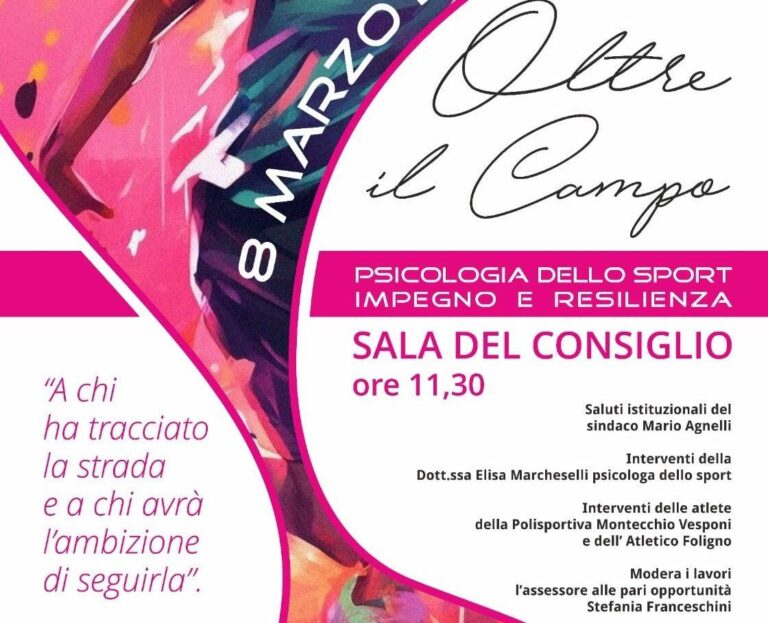 E domani, in Sala San Michele, alle ore 11.30 si terrà un incontro dal titolo “Oltre il Campo – psicologia dello sport impegno e resilienza” al quale parteciperà la dott.ssa Elisa Marcheselli, psicologa dello sport.