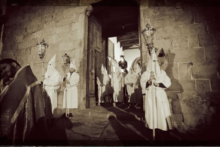 Nel XIV secolo si insediarono nel paese i Padri Agostiniani che dettero un notevole impulso alla vita religiosa locale organizzando processioni cui partecipavano le Confraternite con le loro cappe. Oggi come ieri i cortei seguono lo stesso percorso, muovono dalle Chiese che conservano le sacre immagini, per poi ritornarvi dopo aver fatto l’intero giro del Paese a passo lento e alla luce delle torce.