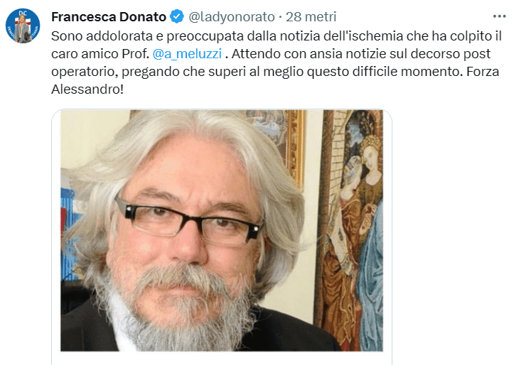 “Sono addolorata e preoccupata dalla notizia dell’ischemia che ha colpito il caro amico Prof. Alessandro Meluzzi.