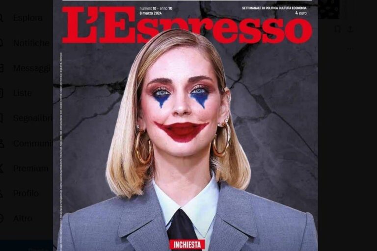 L’Espresso dedica la copertina del nuovo numero a Chiara Ferragni, al centro di un’inchiesta del settimanale sul caso Balocco. “Ferragni spa, il lato oscuro di Chiara” è il titolo che accompagna l’immagine, finita al centro di una bufera mediatica. La copertina, infatti, mostra una foto di Chiara Ferragni truccata da Joker.