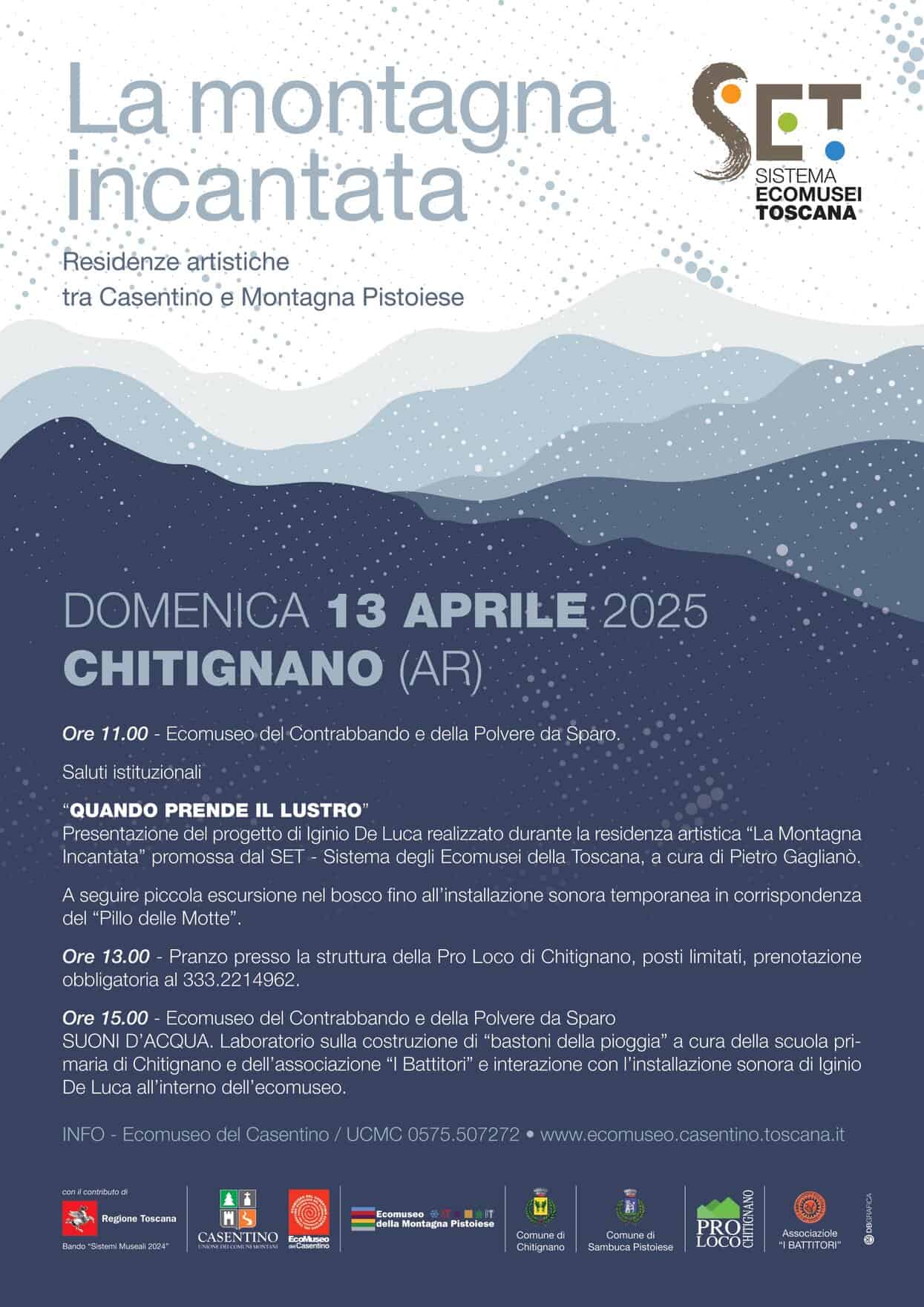 La montagna incantata è un progetto realizzato dal Sistema degli Ecomusei della Toscana (S.E.T.), grazie al cofinanziamento della Regione, affidato alla cura di Pietro Gaglianò, critico d’arte versato nei rapporti tra arte e comunità. Agli indicibili scenari naturali, al valore dei tesori artistici e dei patrimoni antropici di queste aree La montagna incantata aggiunge l’estetica dell’arte contemporanea, che lavora come un contrasto, come un’eresia, come una svolta impensata, e rivela aspetti del mondo inaspettati, talvolta oscurati da una narrazione oleografica e stereotipata.
