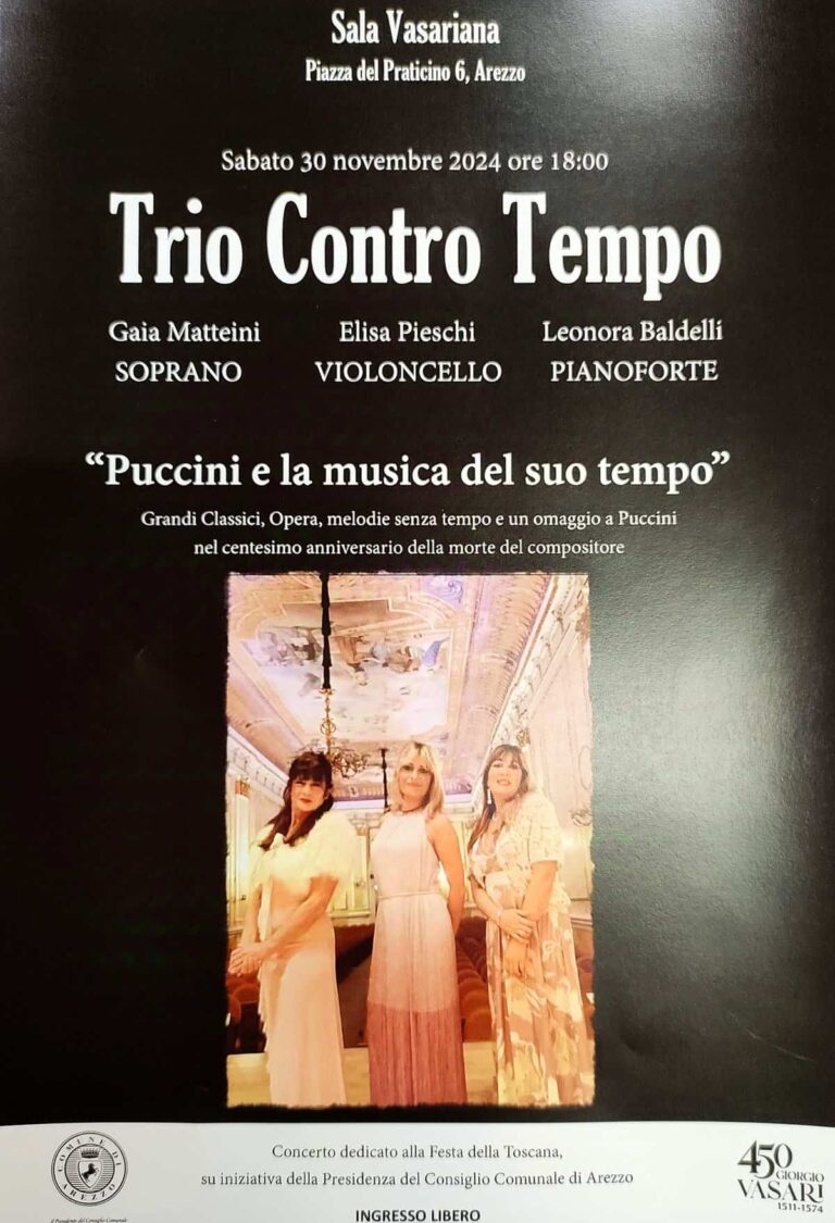 Un omaggio all’arte del celebre compositore nel centenario della sua morte. Eseguiranno i grandi classici dell’artista lucchese il soprano Gaia Matteini, Elisa Pieschi al violoncello e Leonora Baldelli al pianoforte. Insieme compongono il Trio Contro Tempo, formazione aretina tutta al femminile che ha già riscosso importanti riconoscimenti a livello internazionale.