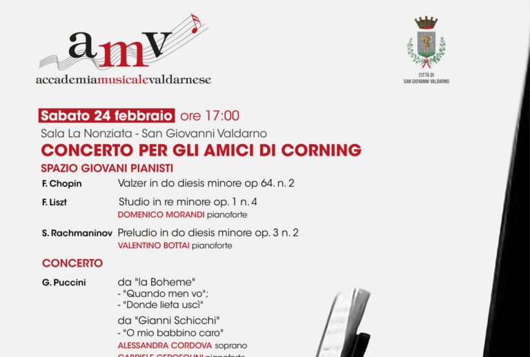 E per salutare gli amici di Corning, sabato 24 febbraio alle 17 l’Accademia musicale valdarnese, in collaborazione con il Comune di San Giovanni Valdarno, ha organizzato un concerto alla sala La Nonziata.