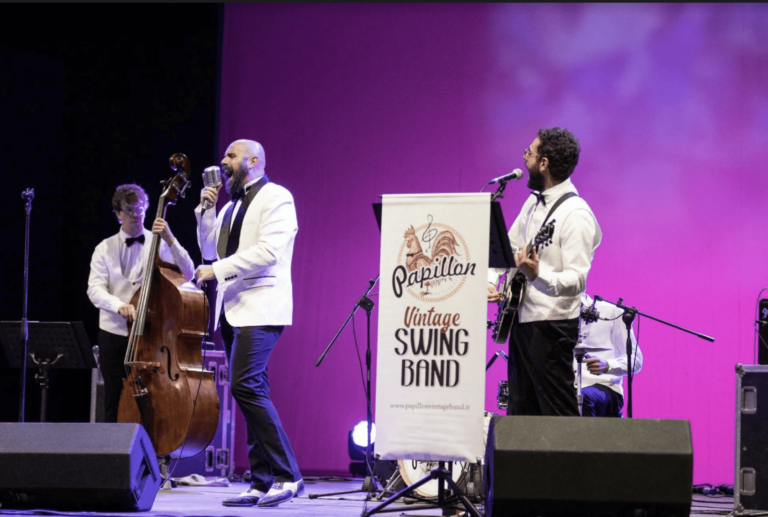 Attraverso un’esplosione di grandi successi dell’epoca e piccoli racconti storici, il pubblico sarà condotto in una magica atmosfera intrisa di nostalgia e di emozioni travolgenti. Sul palco, la Papillon Vintage Swing Band mentre luci e ombre danzano sul palco, con atmosfere suggestive di un’epoca che ha lasciato un’impronta indelebile nella storia della musica italiana.