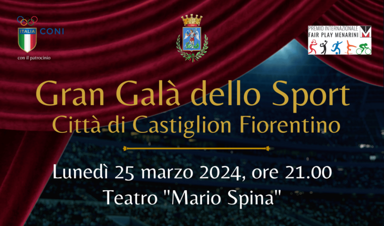 Torna il Gran Galà dello Sport “Città di Castiglion Fiorentino” che si svolgerà lunedì 25 marzo, alle ore 21, nella suggestiva cornice del Teatro comunale “Mario Spina”. Un evento, giunto alla sua VII edizione, che vedrà, anche quest’anno, la partecipazione di affermati campioni, grandi personaggi e giovani promesse del panorama sportivo italiano e internazionale.