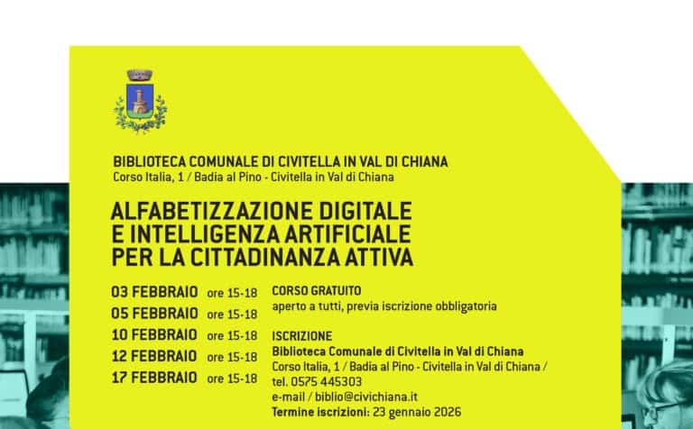 Nella sede della Biblioteca comunale di Civitella, in Corso Italia 1 a Badia al Pino, il secondo corso che potrà essere attivato è quello di Alfabetizzazione digitale e intelligenza artificiale per la cittadinanza attiva.