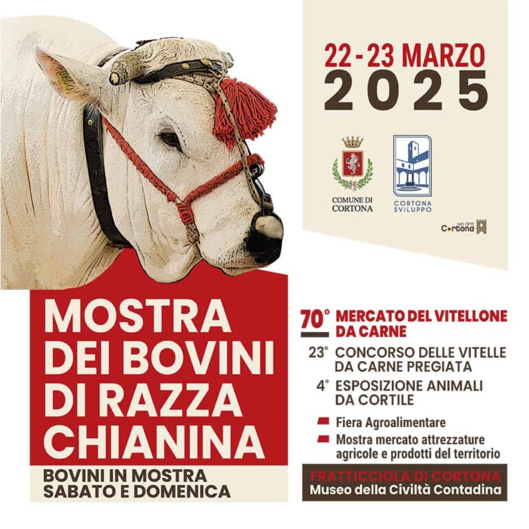 Domenica 23 marzo la giornata si apre con due momenti sportivi: la passeggiata ecologica gruppo trekking Camucia e il raduno del gruppo ciclistico Val di Loreto «La Cortonese», non mancano dimostrazioni ed esibizioni con animali della nostra tradizione contadina, la sfilata con mezzi agricoli d’epoca, la dimostrazione «Come ti cucino la Chianina» con Ilaria Salvadori e, in conclusione della mattinata, la premiazione del concorso dei bovini.