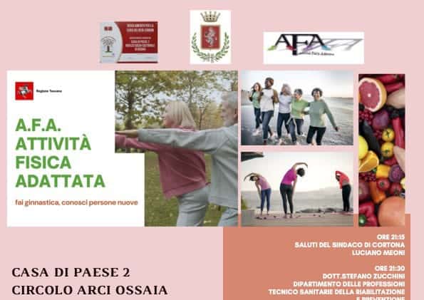 Conoscere i benefici dell’attività fisica adattata, è questo l’obiettivo dell’incontro in programma giovedì 18 aprile intitolato «Afa e non solo». L’appuntamento è fissato per le ore 21 al Circolo Arci (nonché Casa di paese 2) di Ossaia.