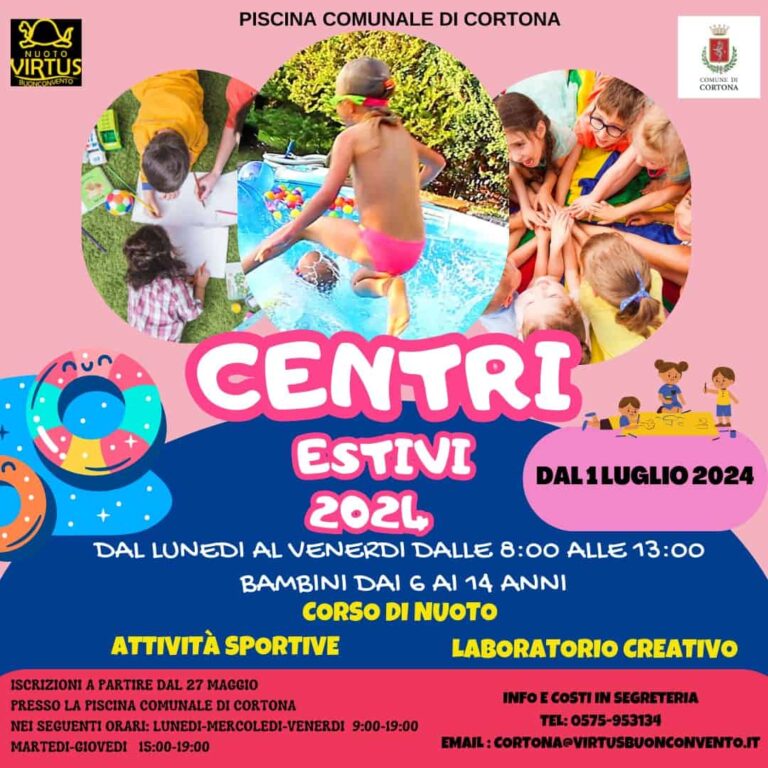 Per chi ama il nuoto, a partire dal primo luglio, tornano i centri estivi alla piscina comunale di Camucia. Le attività sono organizzate da Virtus Buonconvento, si svolgono dalle 8 alle 13 e sono destinate a bambini dai 6 ai 14 anni: si tratta di corsi di nuoto, attività sportive e laboratori creativi. Per iscrizioni rivolgersi alla segreteria della piscina 0575953134 o email cortona@virtusbuonconvento.it