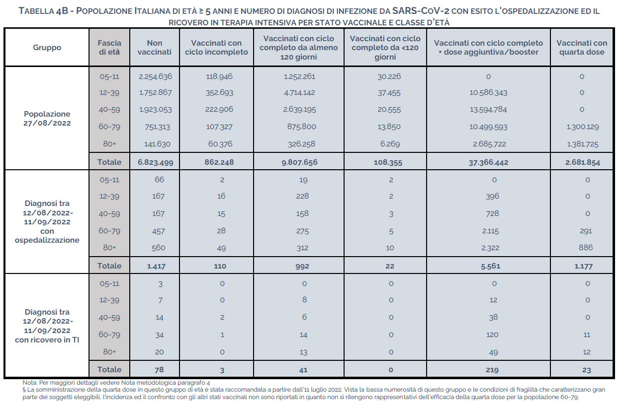 Ci spostiamo a pagina 25) per analizzare la tabella 4B dal titolo “Diagnosi di infezione da Sars Cov-2 con esito l’ospedalizzazione ed il ricovero in terapia intensiva per stato vaccinale e classe di età“.