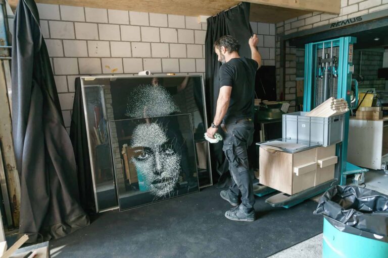invece di crollare su sé stesso, il vetro di sicurezza mantiene i frammenti in posizione. L’incidenza della luce viene riflessa dai frammenti e dalle crepe all’interno del vetro, a seconda dell’illuminazione, sembra che il ritratto stesso risplenda.