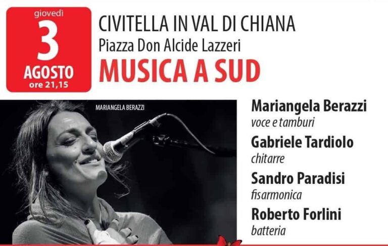 Nell’ambito della rassegna culturale estiva Notti e Note d’Estate promossa dall’Amministrazione comunale di Civitella in Val di Chiana si terranno giovedì 3 e sabato 5 agosto due eventi da non perdere a Civitella, all’interno del circuito Festival delle Musiche, con Musica a Sud e Calici sotto la Torre in collaborazione con Slow Food Val di Chiana.